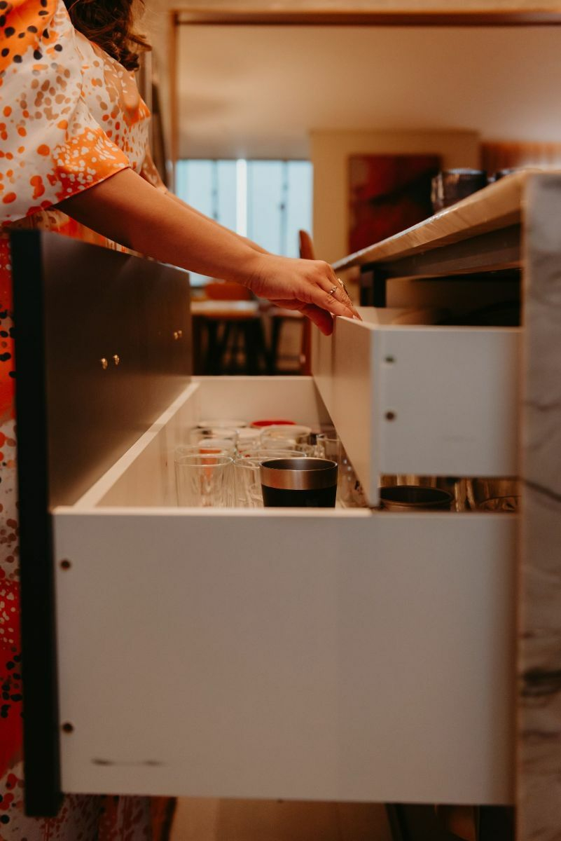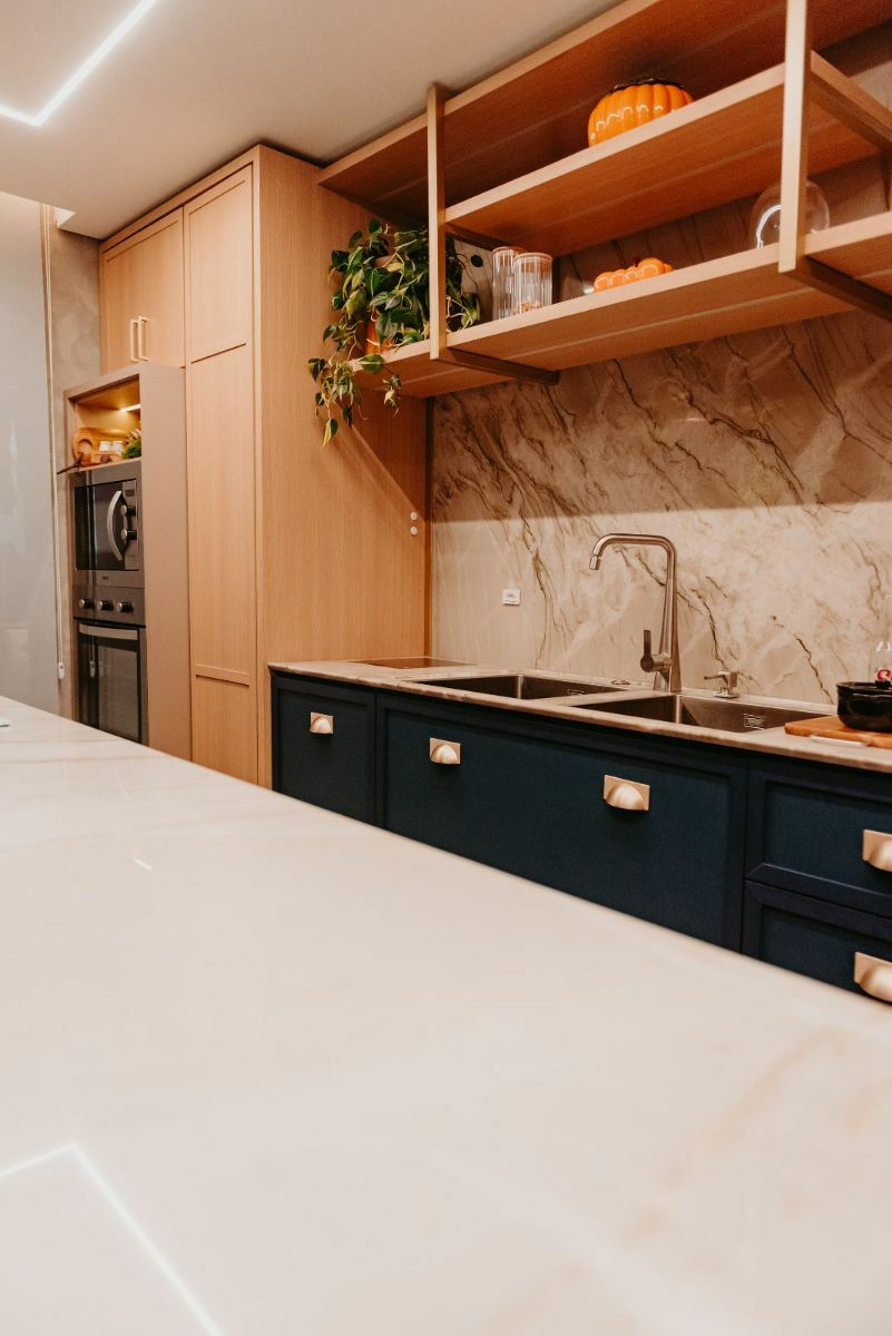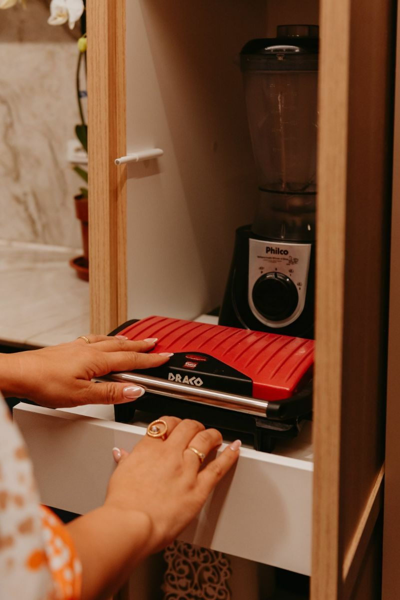 ✔️ Puxadores assinados, ferragens premium, corrediças ocultas com amortecimento;