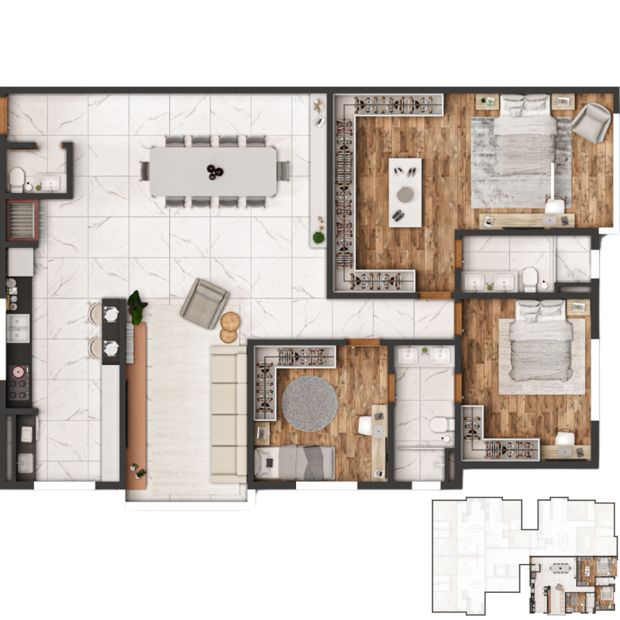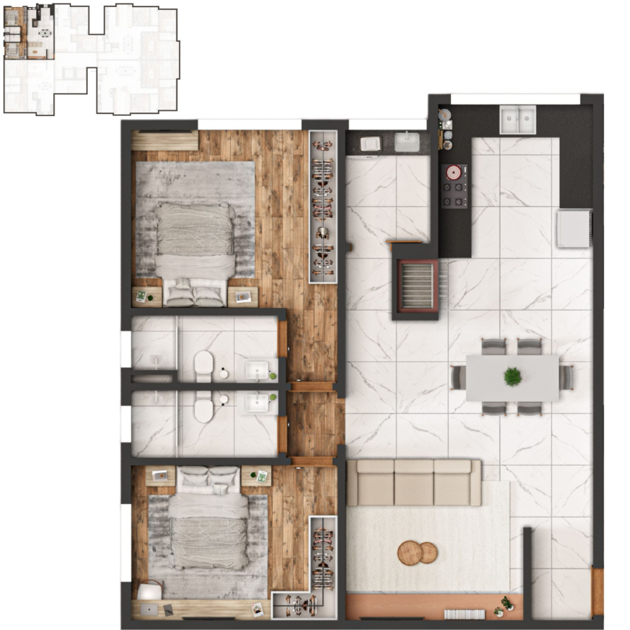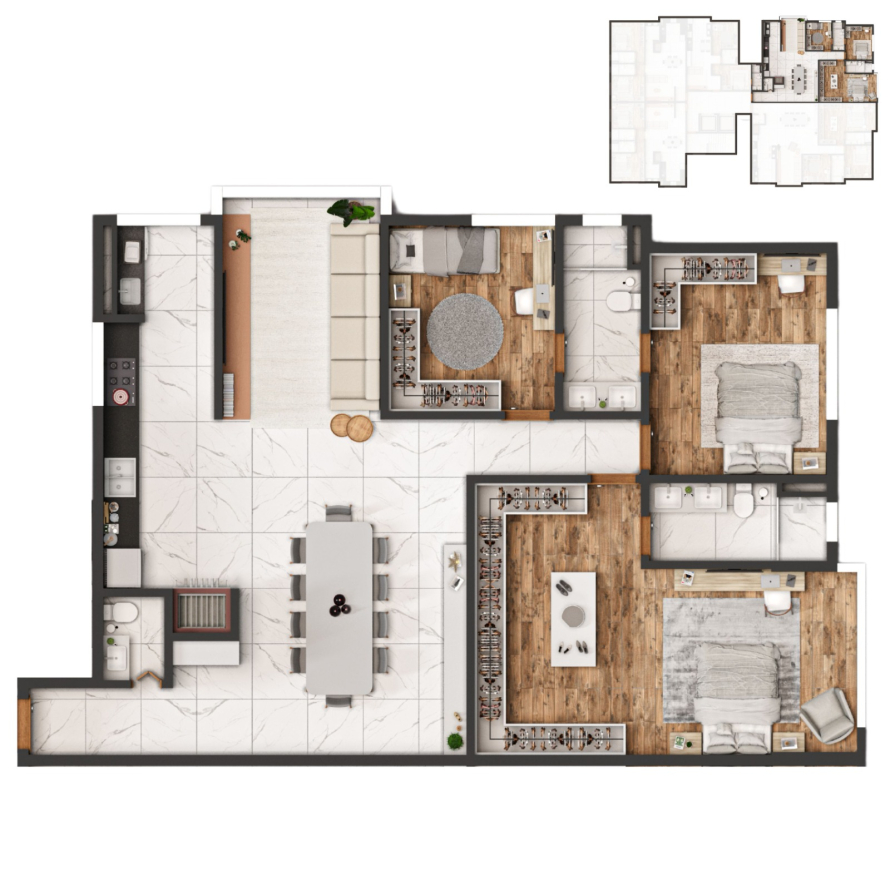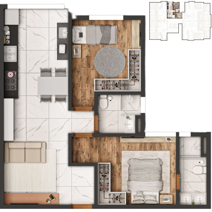 * Apartamentos de 2 Dormitórios com suíte e 3 Dormitórios com suíte e demisuíte.