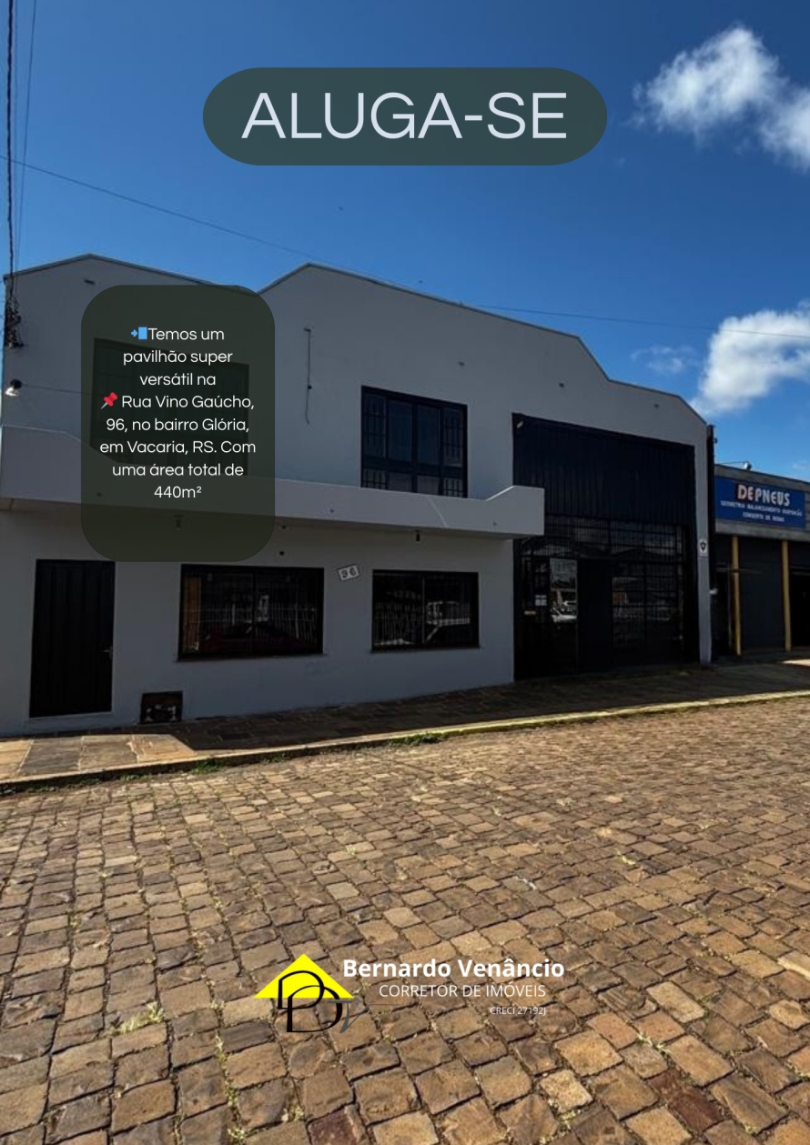 DETALHES: Temos um pavilhão super versátil na Rua Vino Gaúcho, 96, no bairro Glória, em Vacaria, RS. Com uma área total de 440m², esse espaço é perfeito pra você que busca praticidade e conforto. Ah, e tem 3 banheiros pra garantir o bem-estar de todo mundo!